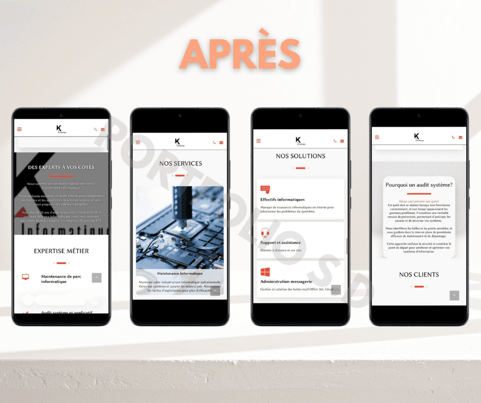 La refonte a transformé le site de K INFORMATIQUE en une vitrine professionnelle et moderne, offrant une navigation intuitive et une présentation valorisante des services.